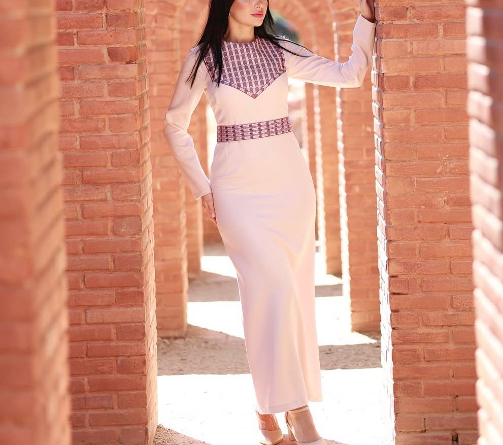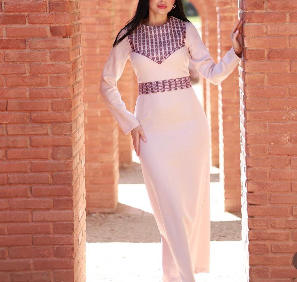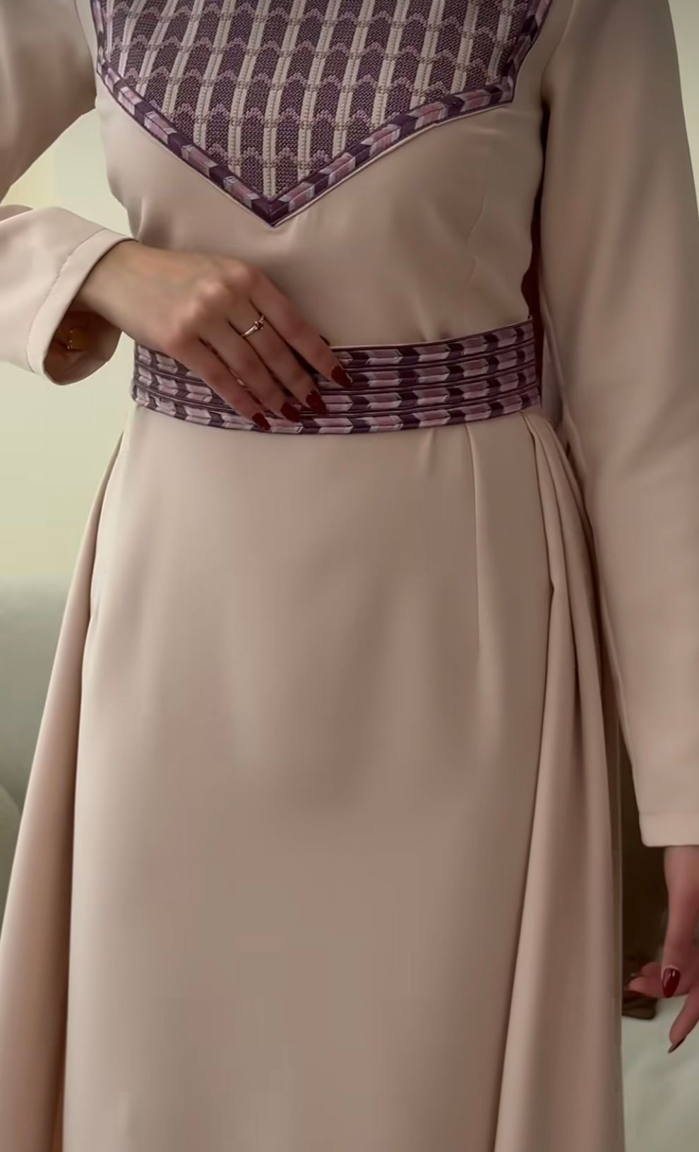 Elegant Cream Color Dress with Pinkish Embroidery and Detachable Back Skirt