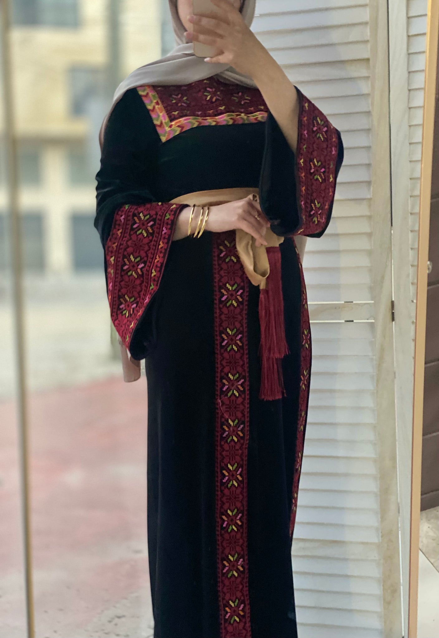 • Stunning new Palestinian black velvet Thob  with Manajil details