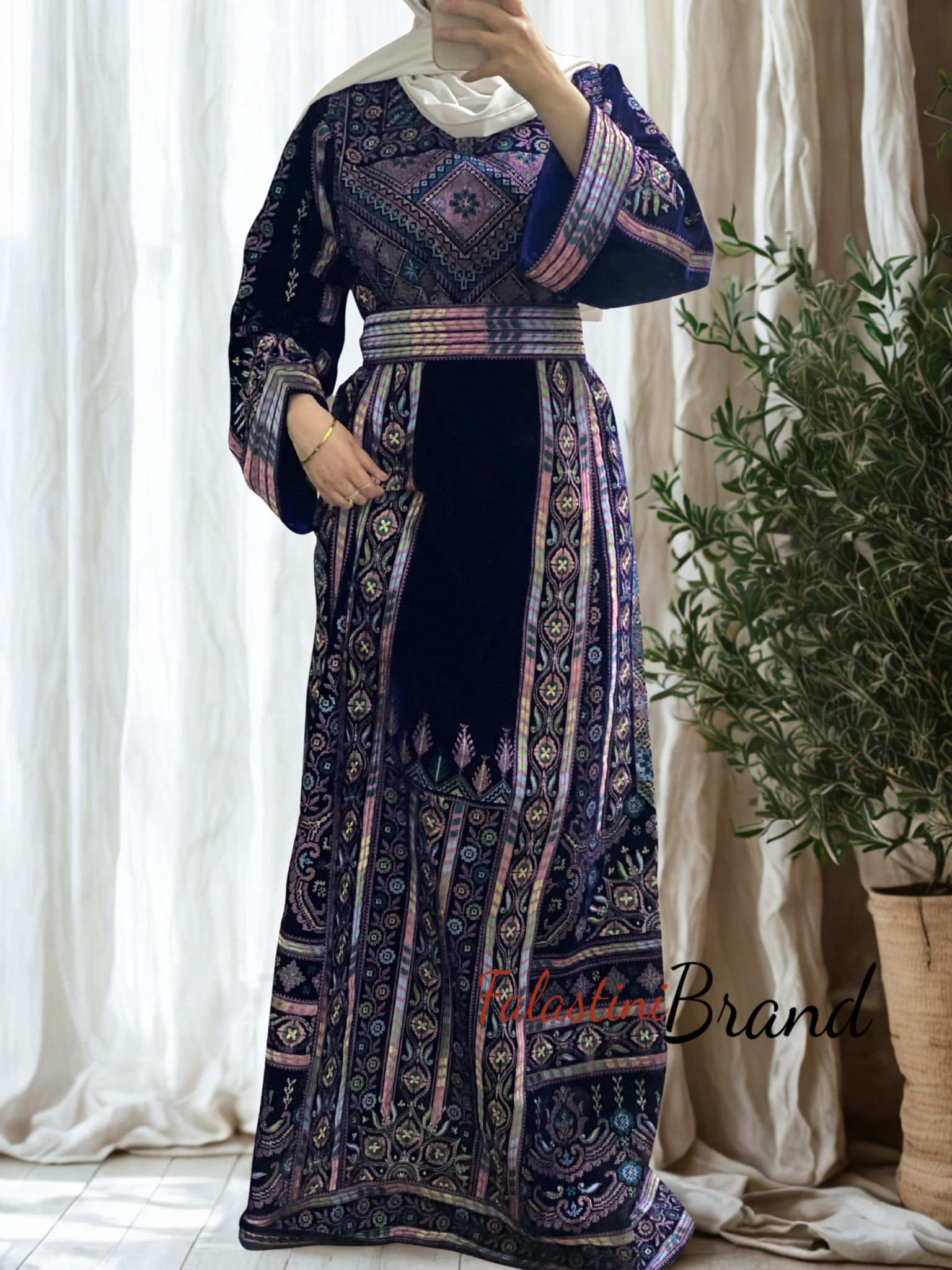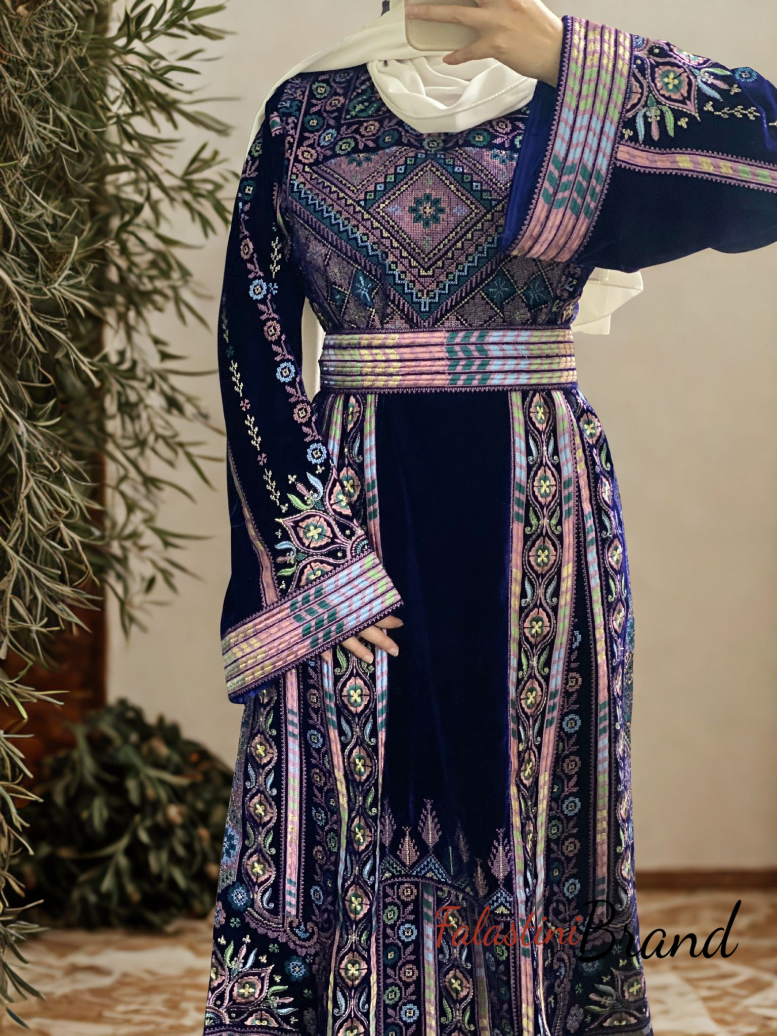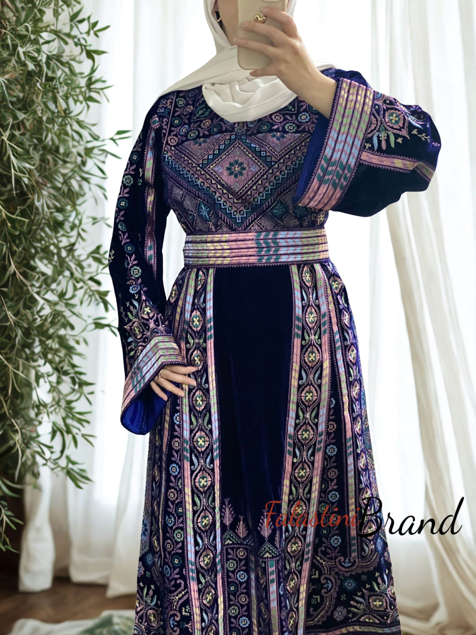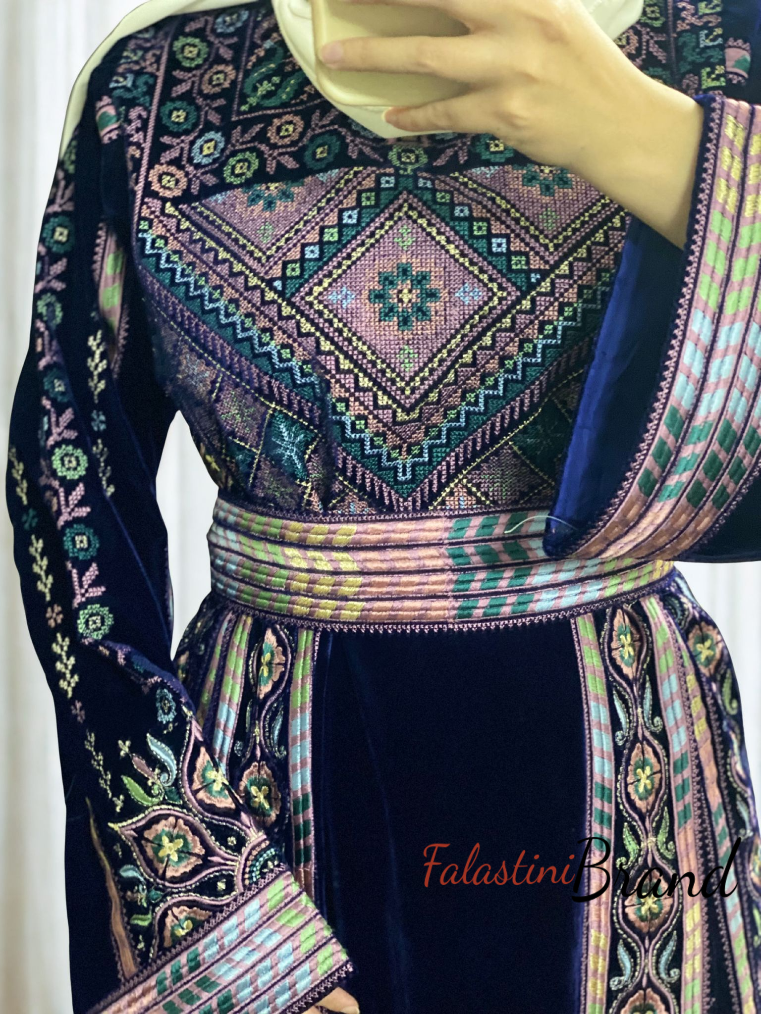 • Elegant Navy Blue Velvet Palestinian embroidered dress