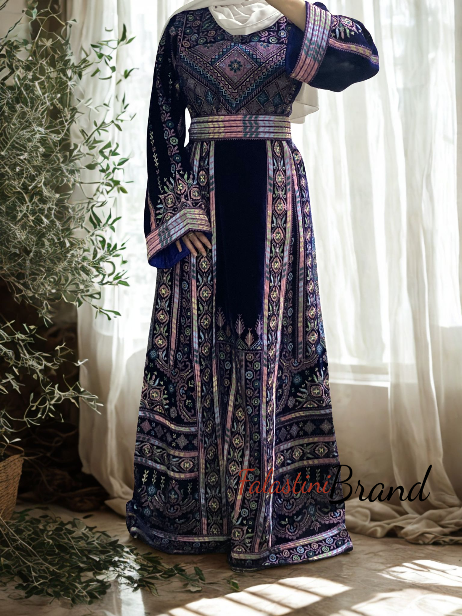 Unique Velvet Navy Blue Palestinian Thobe Dress with Pastel Colors Embroidery